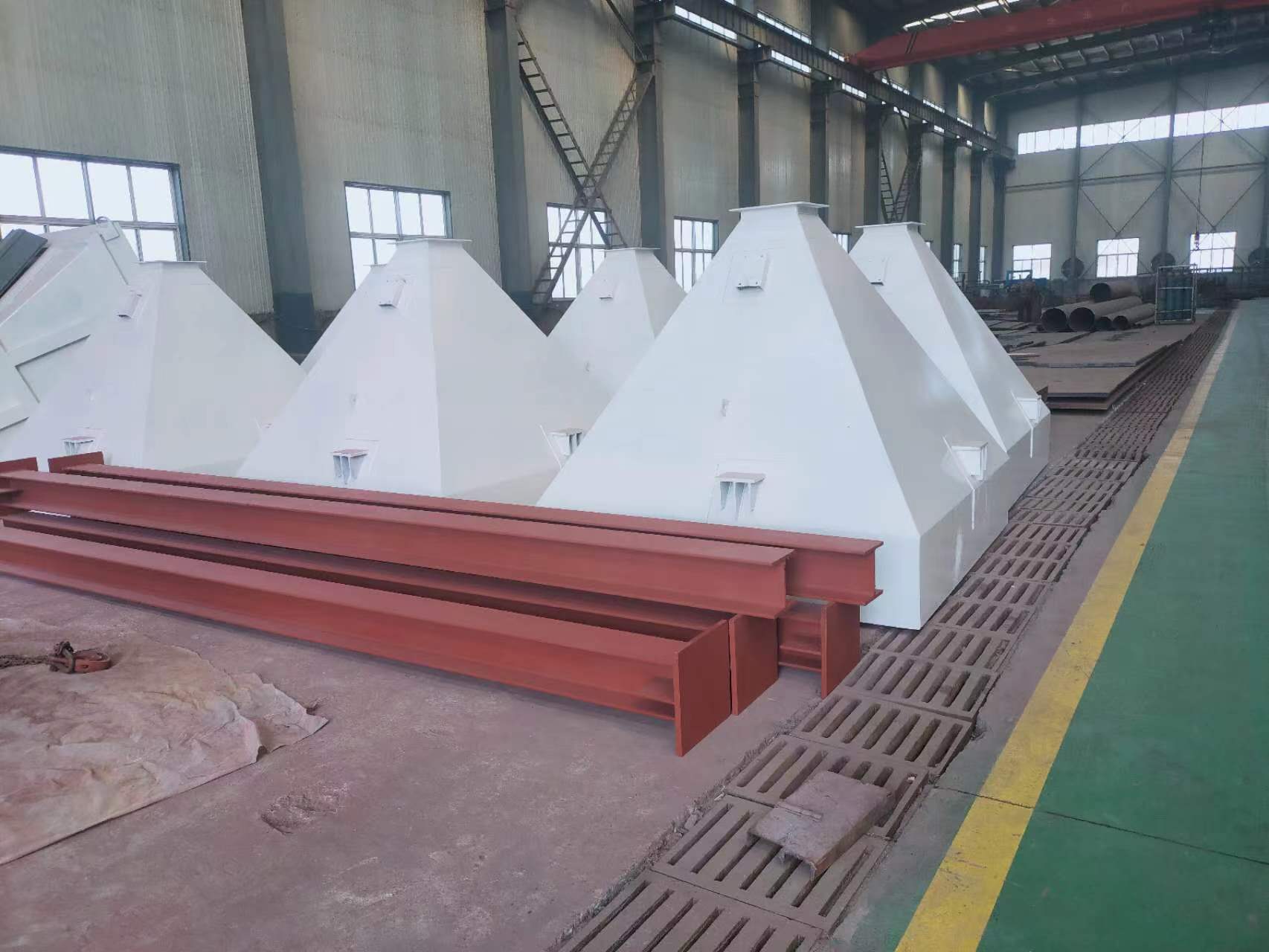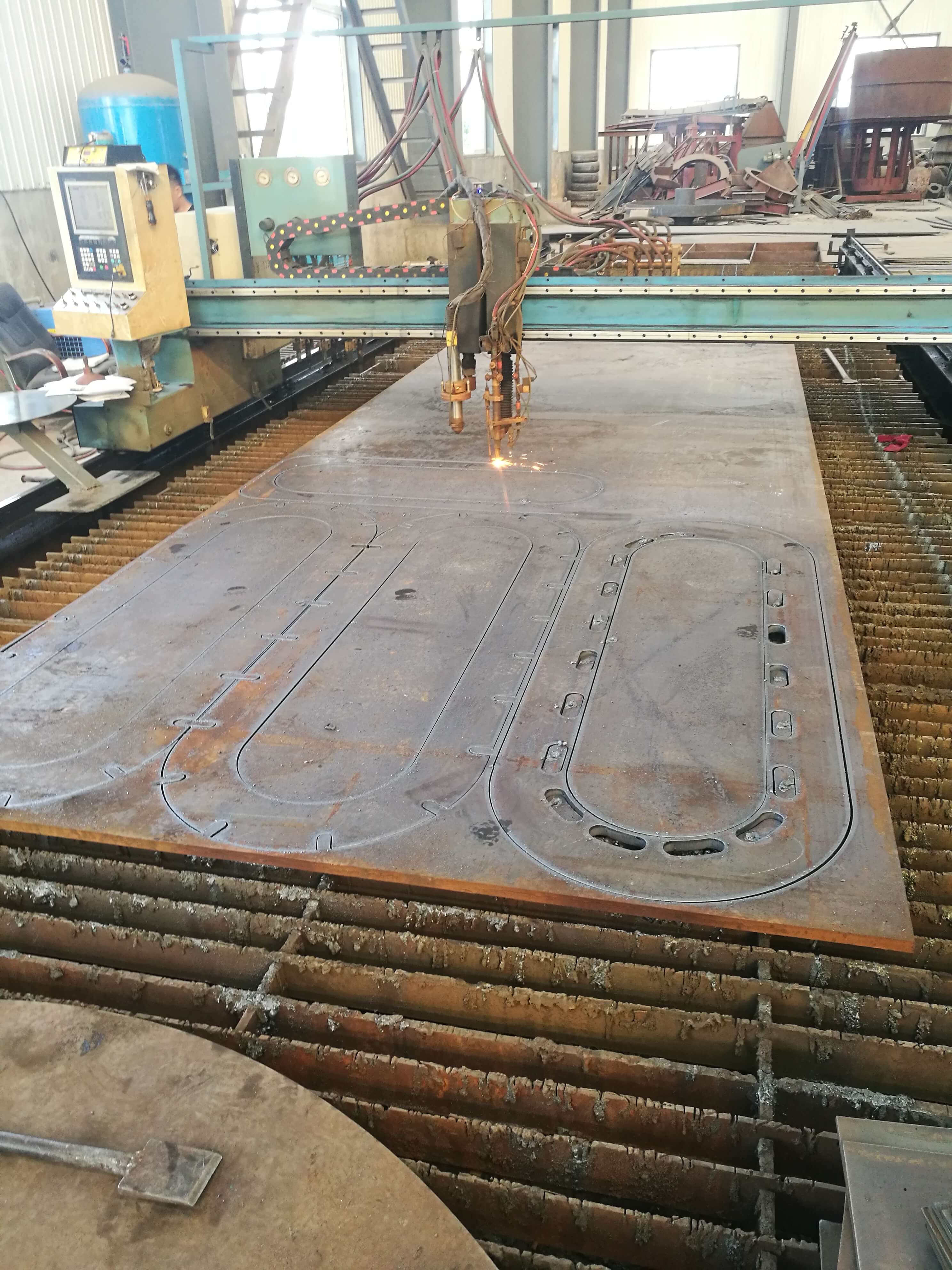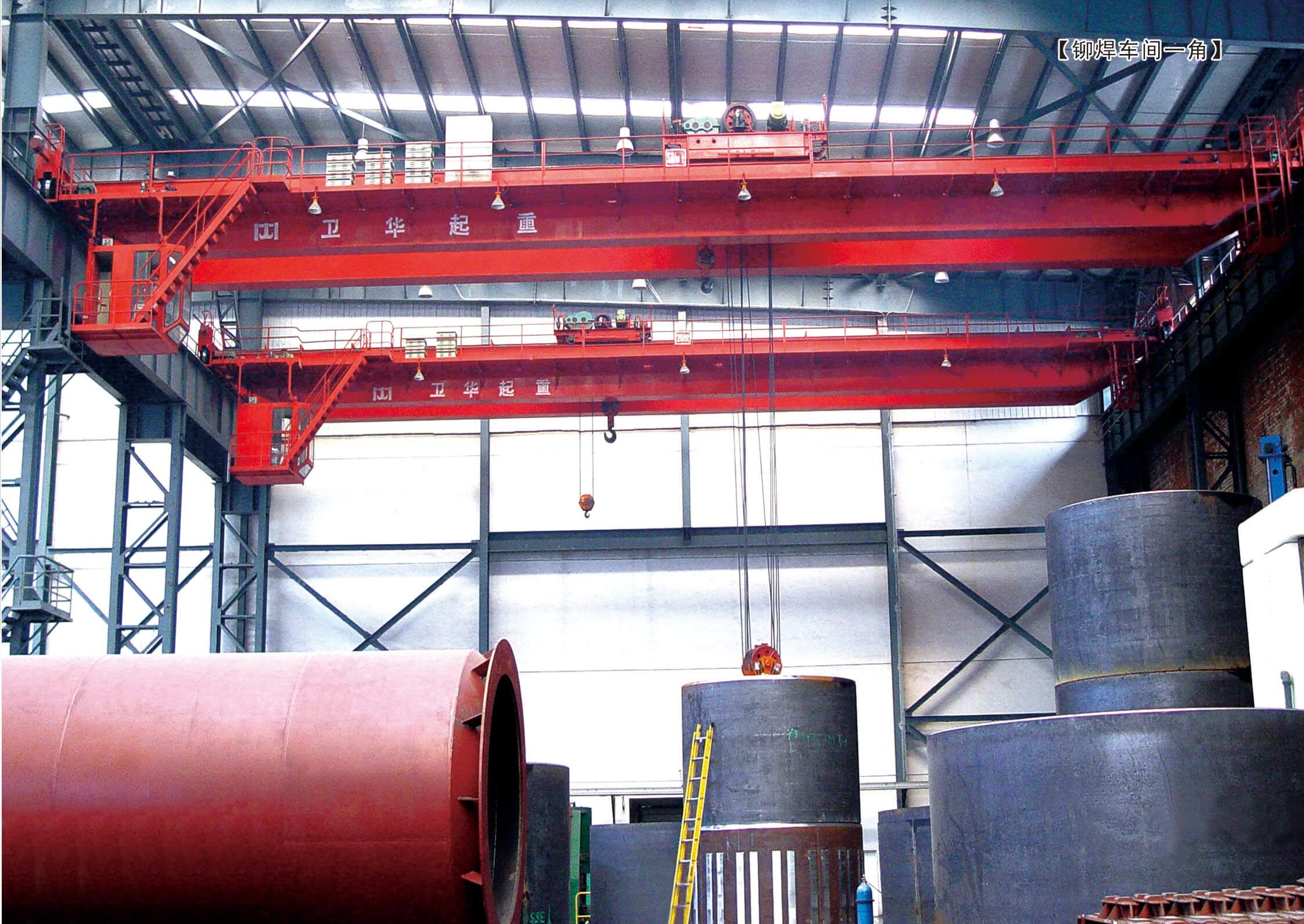 米,50t吊車1臺(tái),20t吊車2臺(tái),5t吊車2臺(tái)。擁有重型門式數(shù)控火焰等離子切割機(jī)1臺(tái);WGD40×2.5m卷板機(jī)2臺(tái);保護(hù)焊機(jī)24臺(tái);W3.2-0.8噴砂機(jī)組1臺(tái)等設(shè)備;