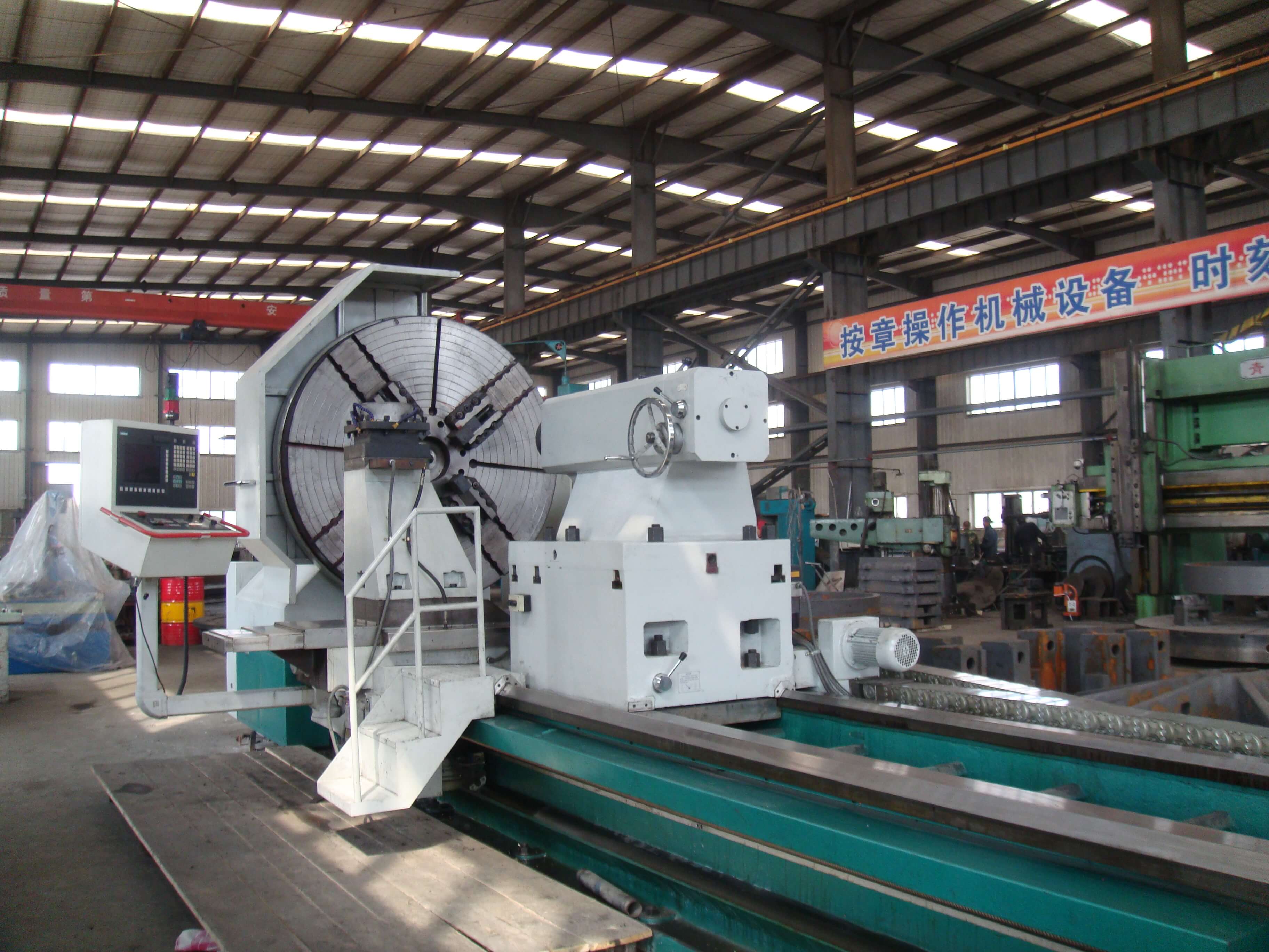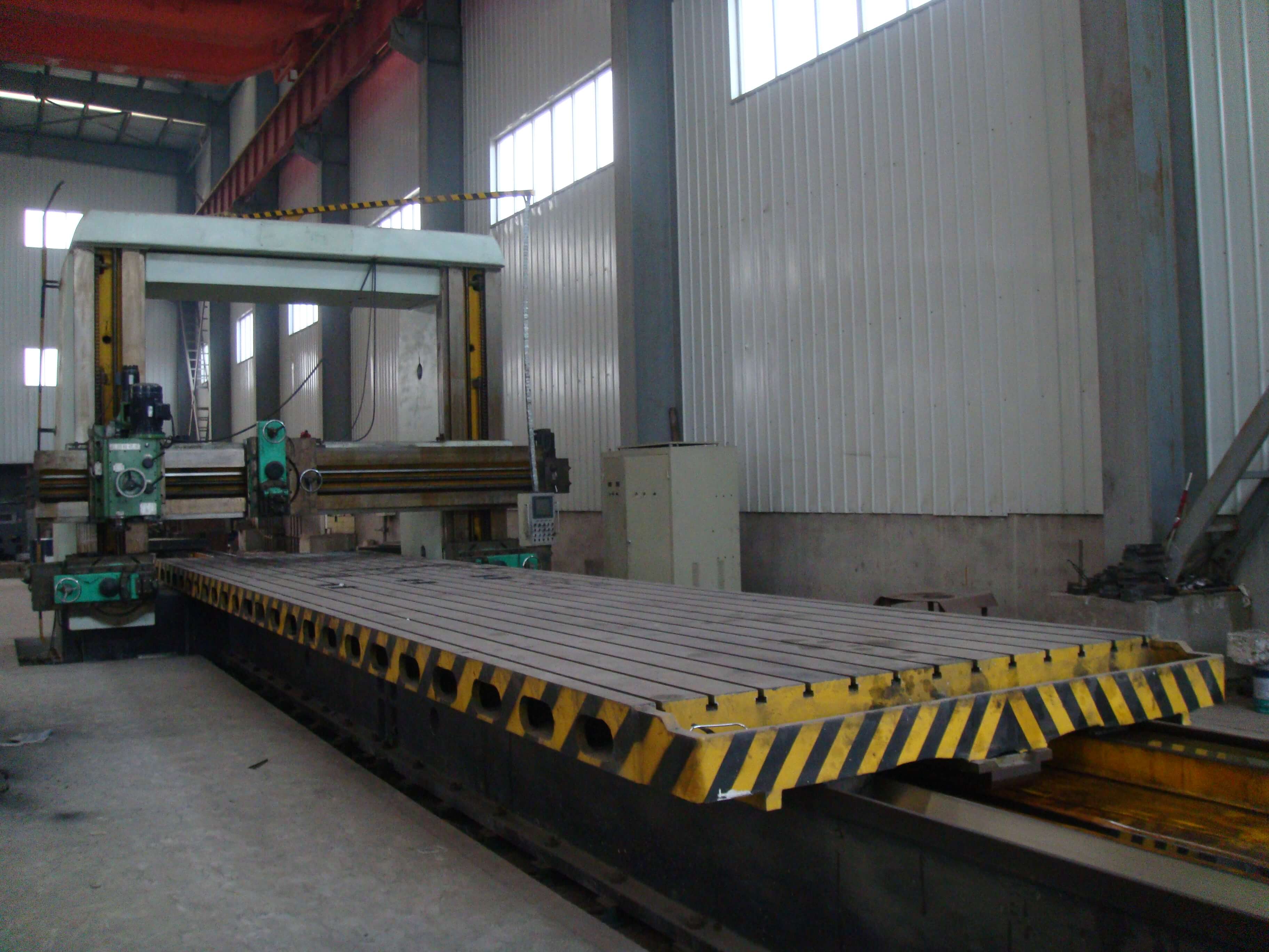 總建筑面積8290平方米,50t吊車(chē)2臺(tái),20t吊車(chē)1臺(tái),10t吊車(chē)5臺(tái)。擁有冷加工設(shè)備68臺(tái)套,包括TK6920-120-50重型數(shù)控落地銑鏜床,HC1200A臥式數(shù)控加工心,CKD61210/5000mm數(shù)控臥式車(chē)銑專(zhuān)機(jī)1臺(tái);12m×2.5m重型刨銑磨床1臺(tái);?200落地鏜床1臺(tái);TPX6113鏜床1臺(tái);T6111鏜床1臺(tái);立式車(chē)床4.0米、2.5米、1.25米、0.8米等10臺(tái);CAK系列數(shù)控車(chē)床6臺(tái)套;CW61100普車(chē)3臺(tái);CW6280B普車(chē)3臺(tái);滾齒機(jī)、插齒機(jī)、線切割、平面磨床等;